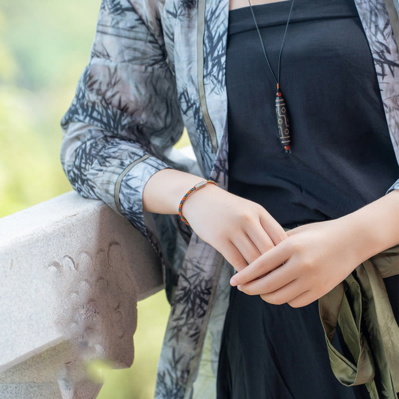 The bracelet features red, green, and multicolored strings symbolizing powerful Tibetan Buddhist values: red for life force, green for balance and harmony, and vibrant multicolor for connection and spiritual growth. Each color infuses your bracelet with protective and positive energy.