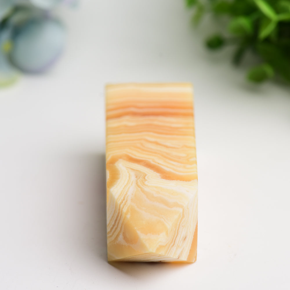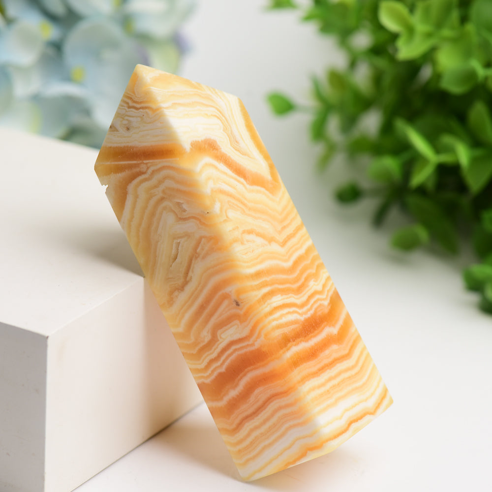 Jeder Turm wird sorgfältig poliert, um die natürliche Schönheit des Orangencalcits mit seinen wirbelnden Mustern in Sonnenuntergangstönen von blassem Pfirsich bis zu tiefem Bernstein hervorzuheben. Das beachtliche Gewicht (ca. 300–500 g) verleiht diesen Türmen eine beeindruckende Präsenz auf Altären, Schreibtischen oder Meditationsräumen.