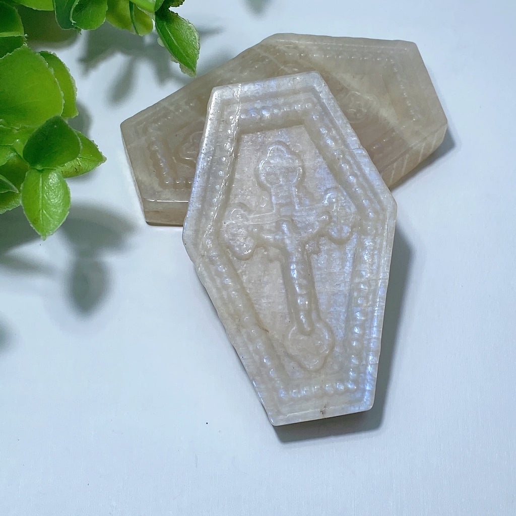 This lovely peach moonstone coffin carving is renowned for enhancing intuition, emotional balance, and gentle energy. It's a soothing crystal that supports spiritual growth and healing.
