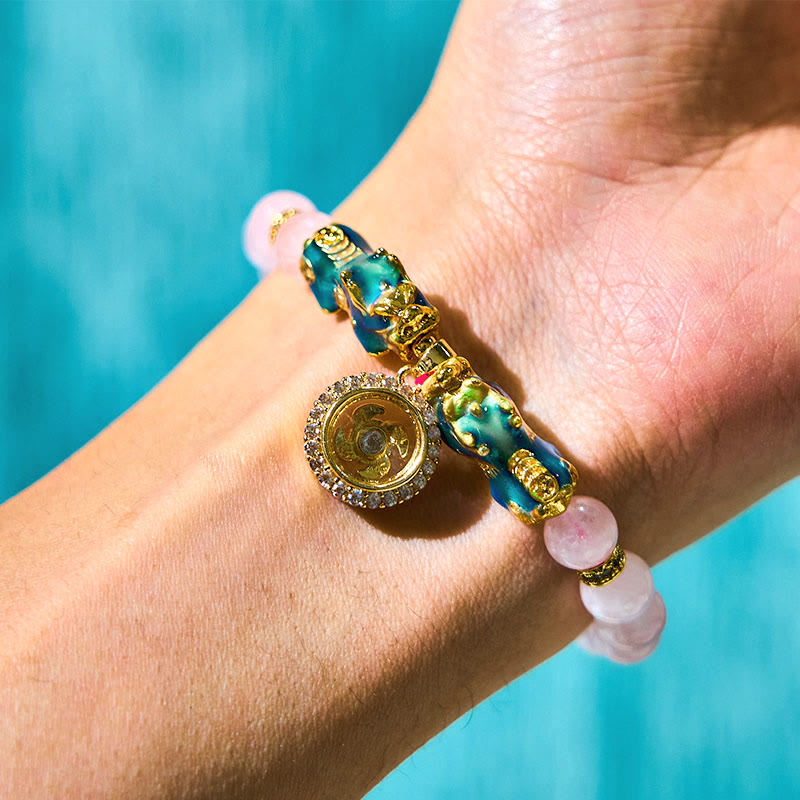 Das Herzstück dieses heilenden Kristallschmuckstücks ist der faszinierende Pixiu-Anhänger – ein Fabelwesen, das in vielen östlichen Traditionen als mächtiger Anziehungspunkt für Wohlstand und Beschützer vor negativen Energien verehrt wird. Der Pixiu auf diesem Armband verfügt über eine einzigartige thermochrome Eigenschaft, die es ihm ermöglicht, seine Farbe mit Ihrer Körpertemperatur zu ändern und so ein magisches, interaktives Erlebnis zu schaffen.