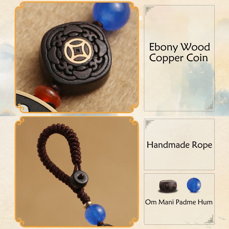 Dieser Schlüsselanhänger ist aus Ebenholz gefertigt und mit Kupfermünzen , Kokosnussschalen, rotem Achat, Seilen und Messing kombiniert, was jeweils zu seinen einzigartigen ästhetischen und spirituellen Eigenschaften beiträgt.