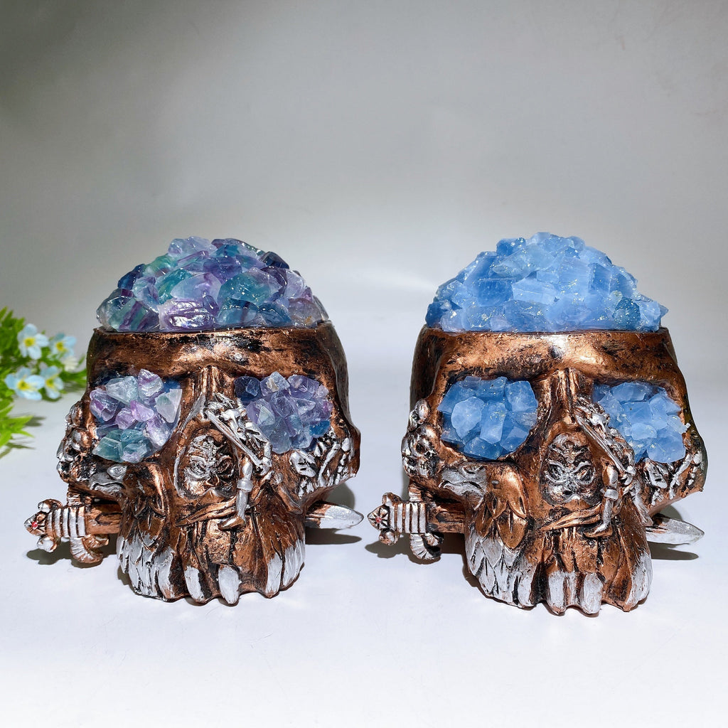 This unique skull lamp combines the calming energy of fluorite with the soothing vibrations of celestite. Fluorite is known for enhancing clarity and spiritual focus, while celestite supports peace and tranquility. Together, they create a powerful crystal healing ambiance perfect for meditation and energy balancing.