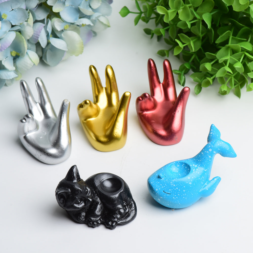 The color finish varies among the designs — red, silver, gold hands, a matte blue whale, and glossy black cat. Each piece is unique due to resin's natural variation and the handcrafted style, adding charm to your décor.