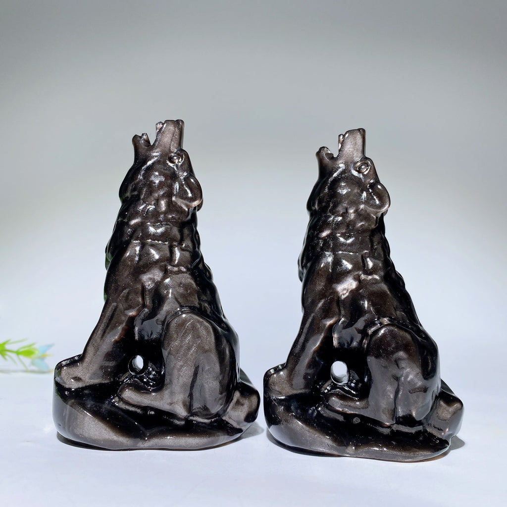 The 4.0" silver obsidian crystal wolf carving symbolizes protection and strengthens your wolf spirit animal connection. It promotes grounding, intuition, and healing energy, making it ideal for meditation and spiritual rituals.