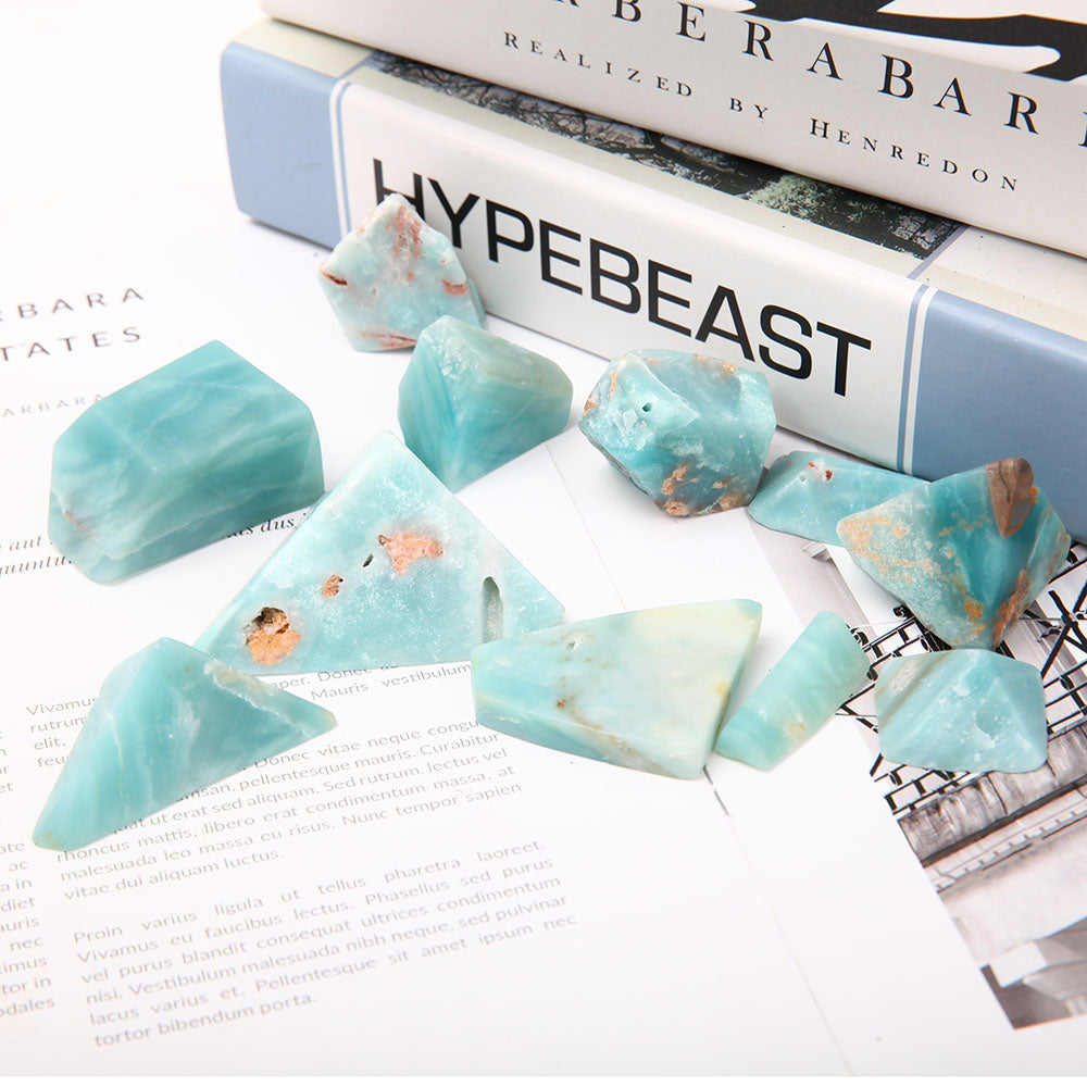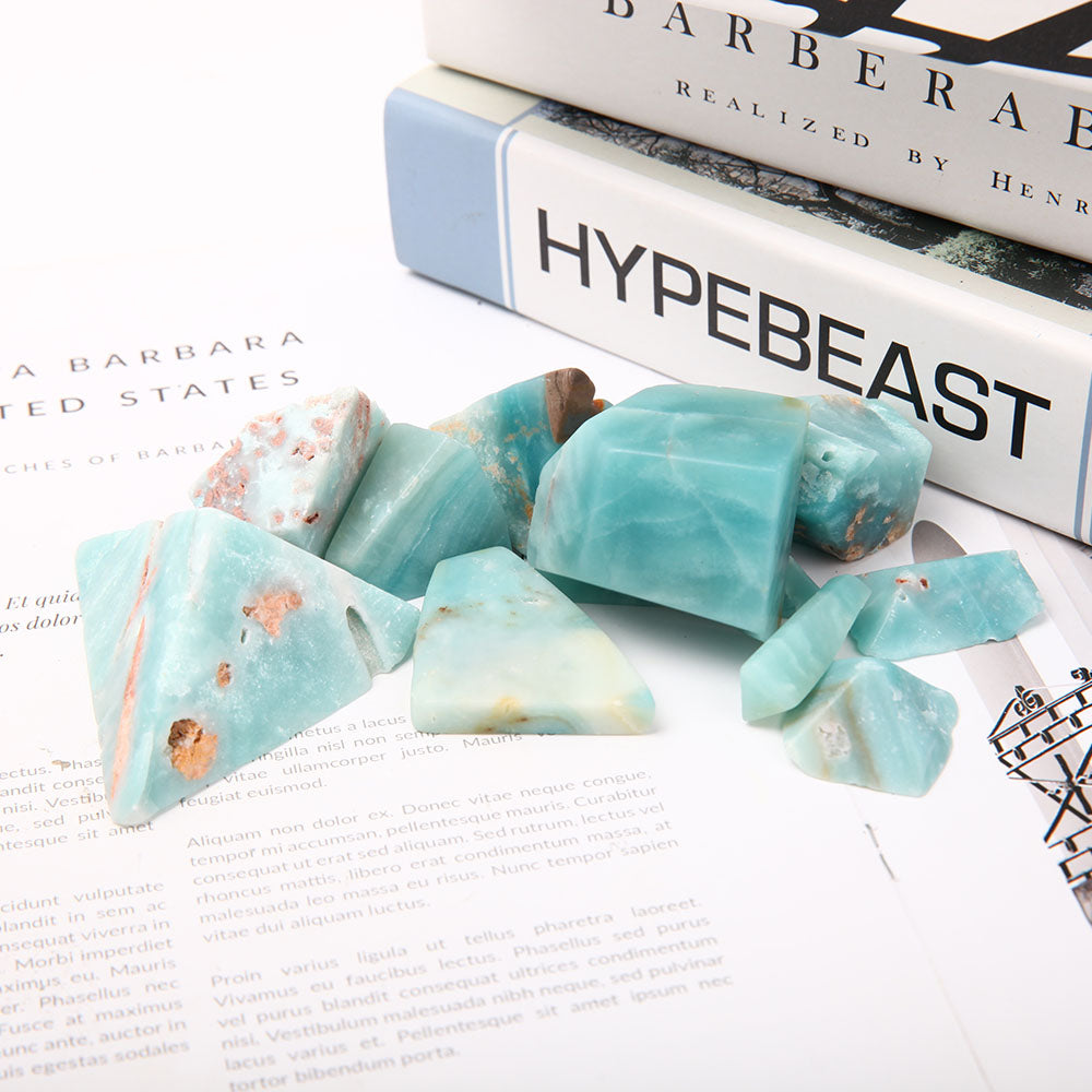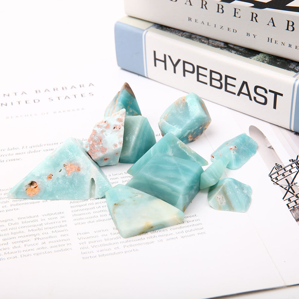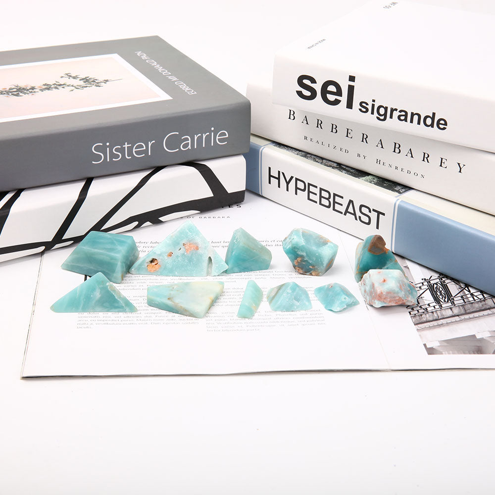 Für diejenigen, die sich von der Kraft roher Steine angezogen fühlen, umfasst unsere Kollektion auch andere natürliche Kristallarten wie rohen Amethyst und rohen Rosenquarz, die diese himmelblauen Stücke wunderschön ergänzen.