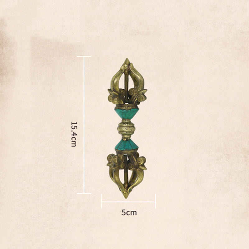 Der Vajra Dorje ist ca. 15,4 cm x 5 cm lang und wiegt ca. 290 Gramm. Er hat die perfekte Größe für die Altardekoration und die Handhabung bei Ritualen.