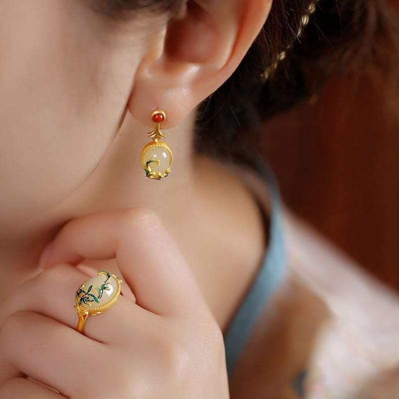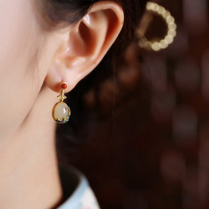 Die Ohrringe sind etwa 2,3 cm lang und 0,95 cm breit. Sie bestehen aus natürlicher Jade , rotem Achat und Kupfer mit einer kupferplattierten Goldoberfläche und vereinen so natürliche Schönheit mit Haltbarkeit.