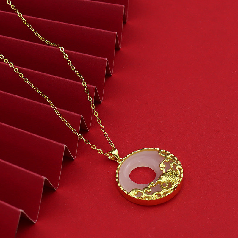 Unsere Halskette mit einem Koi-Fisch aus weißem Jade symbolisiert Glück, Schutz und Wohlstand . Weißer Jade wird für seine Fähigkeit geschätzt, Ruhe, Harmonie und Glück zu bringen, während der Koi-Fisch für Erfolg und Glück steht. Das Tragen dieser Halskette bringt positive Energie und Segen in Ihr Leben.