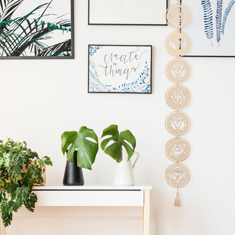 This handcrafted wood chakra wall hanger promotes balanced energy flow throughout your home, encouraging positive change, good luck, and spiritual harmony.