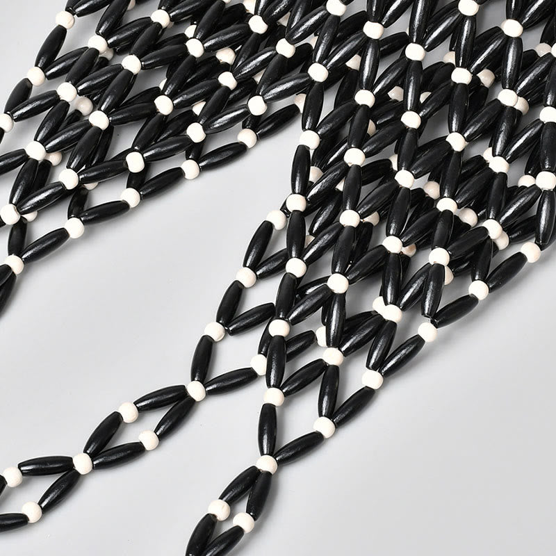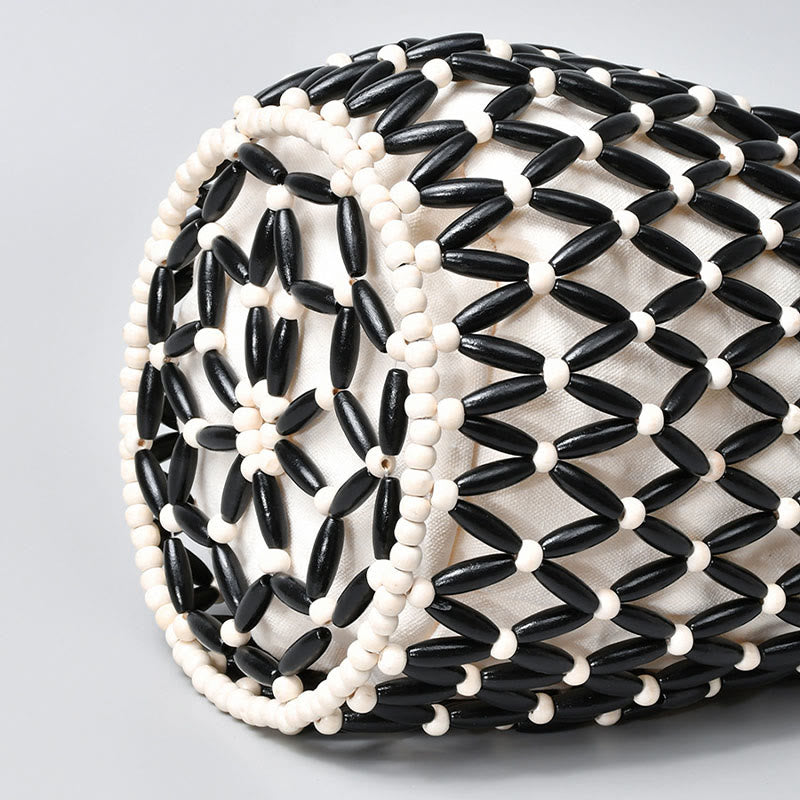Diese sorgfältig handgewebte Beuteltasche besticht durch ihre markante zylindrische Silhouette, die sich von herkömmlichen Handtaschen abhebt. Die natürlichen Holzperlen erzeugen ein haptisches Erlebnis, das Sie mit irdischen Elementen verbindet und gleichzeitig eine raffinierte Bohème-Ästhetik bewahrt, die sich sowohl für legere Ausflüge als auch für besondere Anlässe eignet.