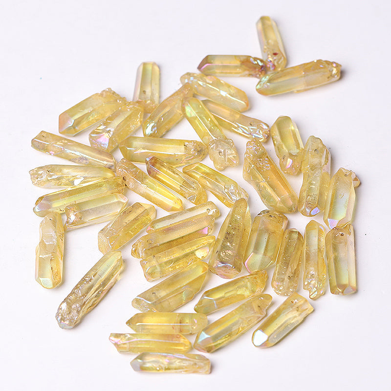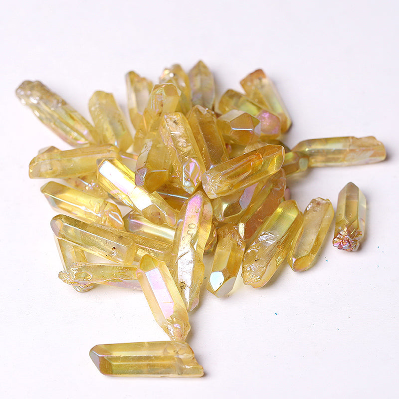 Yellow Aura Quartz crystal points are known for their uplifting energy that promotes joy, creativity, and mental clarity. They support manifestation and spiritual growth, making them ideal for meditation and energy healing practices.