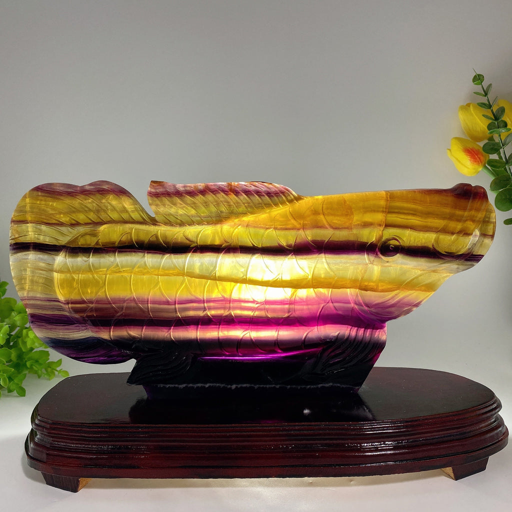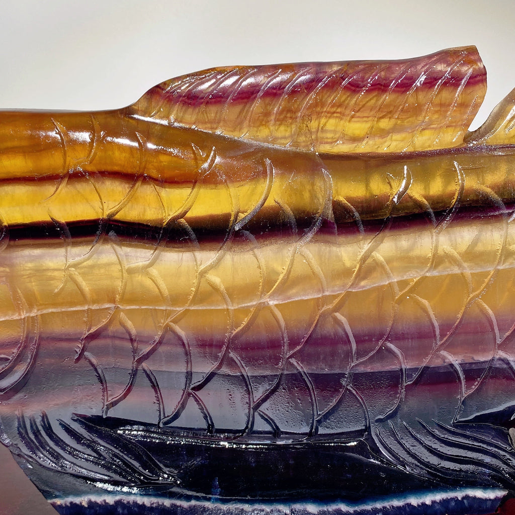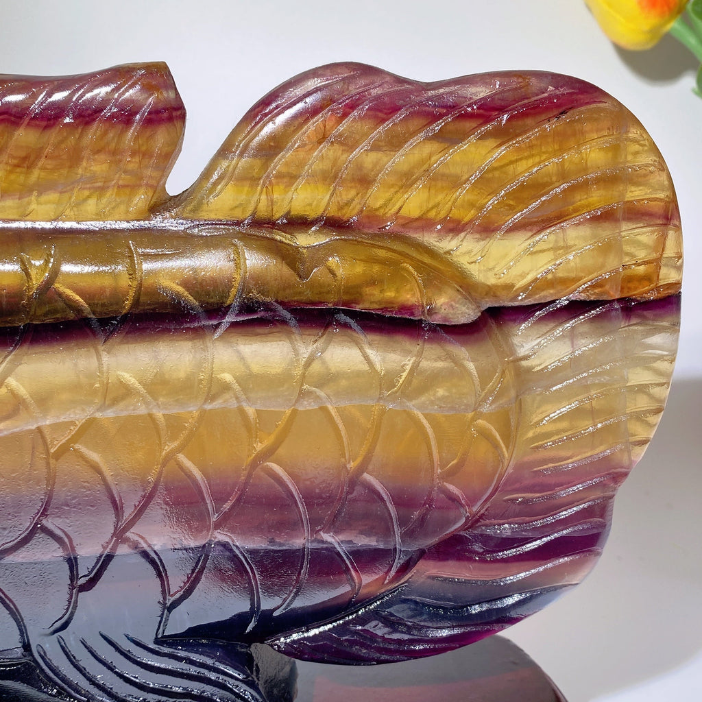 This yellow fluorite arowana carving is believed to enhance energy flow and mental clarity. It is used to promote emotional balance and spiritual healing, making it a powerful addition to your crystal collection.