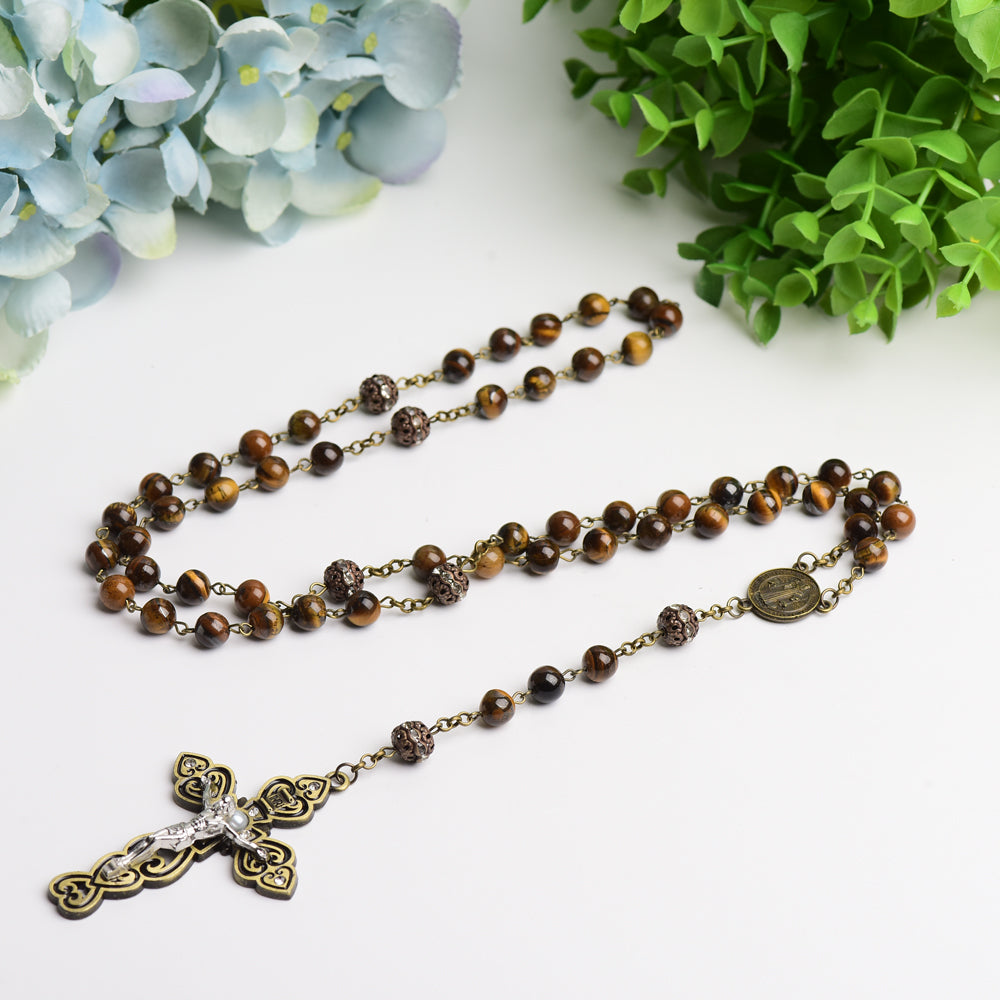 The necklace weighs approximately 2.82 ounces (approx. 80 grams) and features smooth round tiger eye beads paired with a metal cross pendant, fitting comfortably for most wearers.