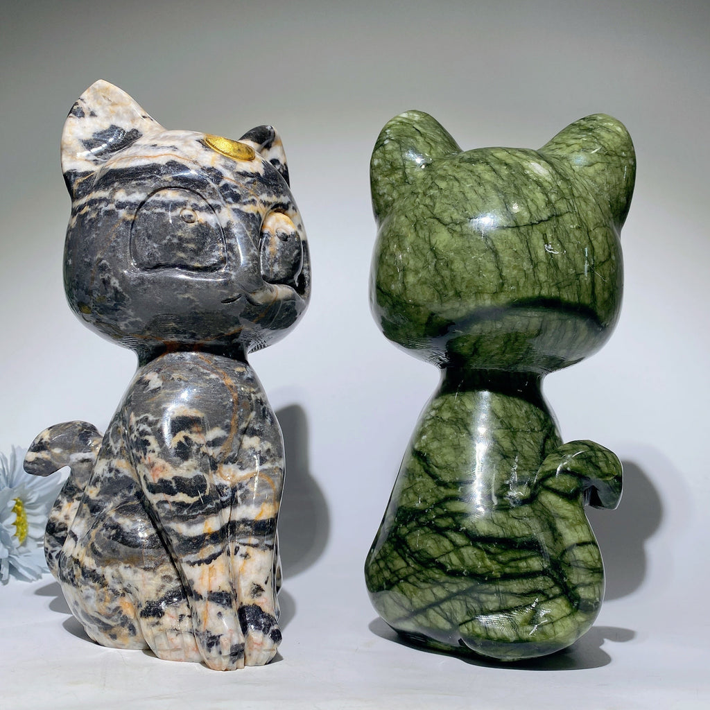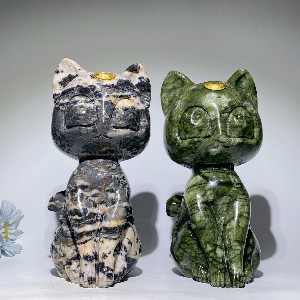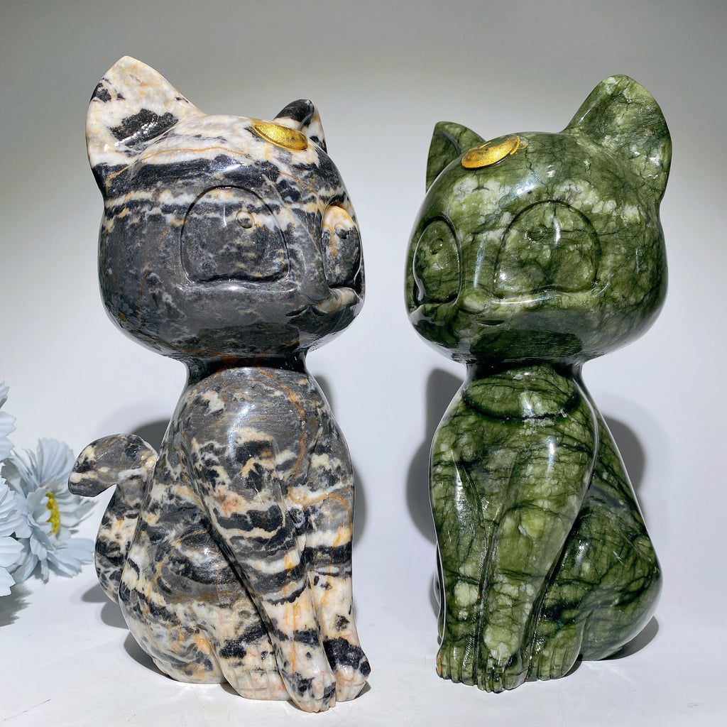 Jede Katzenschnitzerei wird aus echtem Zebrajaspis und Serpentin handgefertigt und sorgfältig nach Qualität, Farbe und glatt polierter Oberfläche ausgewählt. Diese Natursteine sorgen für authentische energetische Eigenschaften.