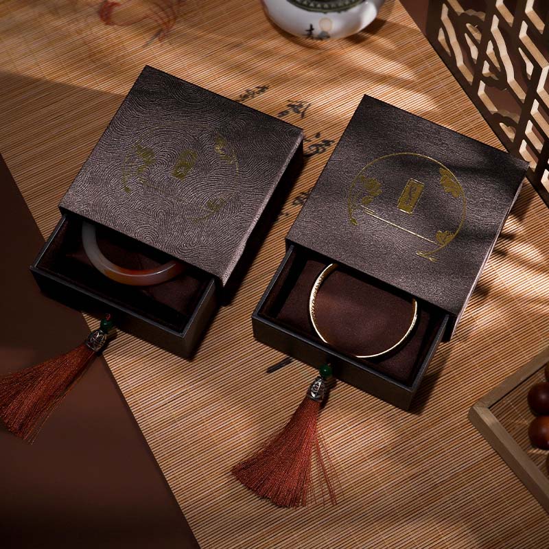 The box measures 4.5 x 4.49 x 1.81 inches externally (approx. 11.5 x 11.4 x 4.6 cm) with an internal space of 3.94 x 3.74 x 1.38 inches (approx. 10 x 9.5 x 3.5 cm). It's perfect for bangles, bracelets, and small jewelry or art pieces like jade or wood.