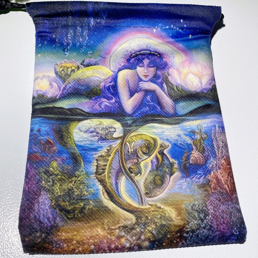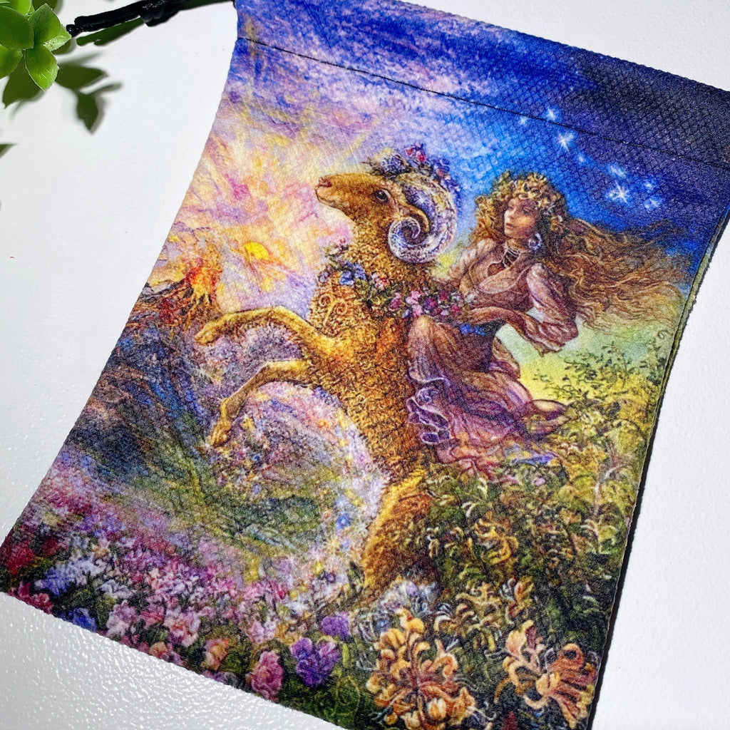 The bag is made from a soft, textured fabric designed for everyday use and spiritual practices. To preserve its quality and printed designs, hand wash gently and avoid harsh chemicals or abrasive cleaners.